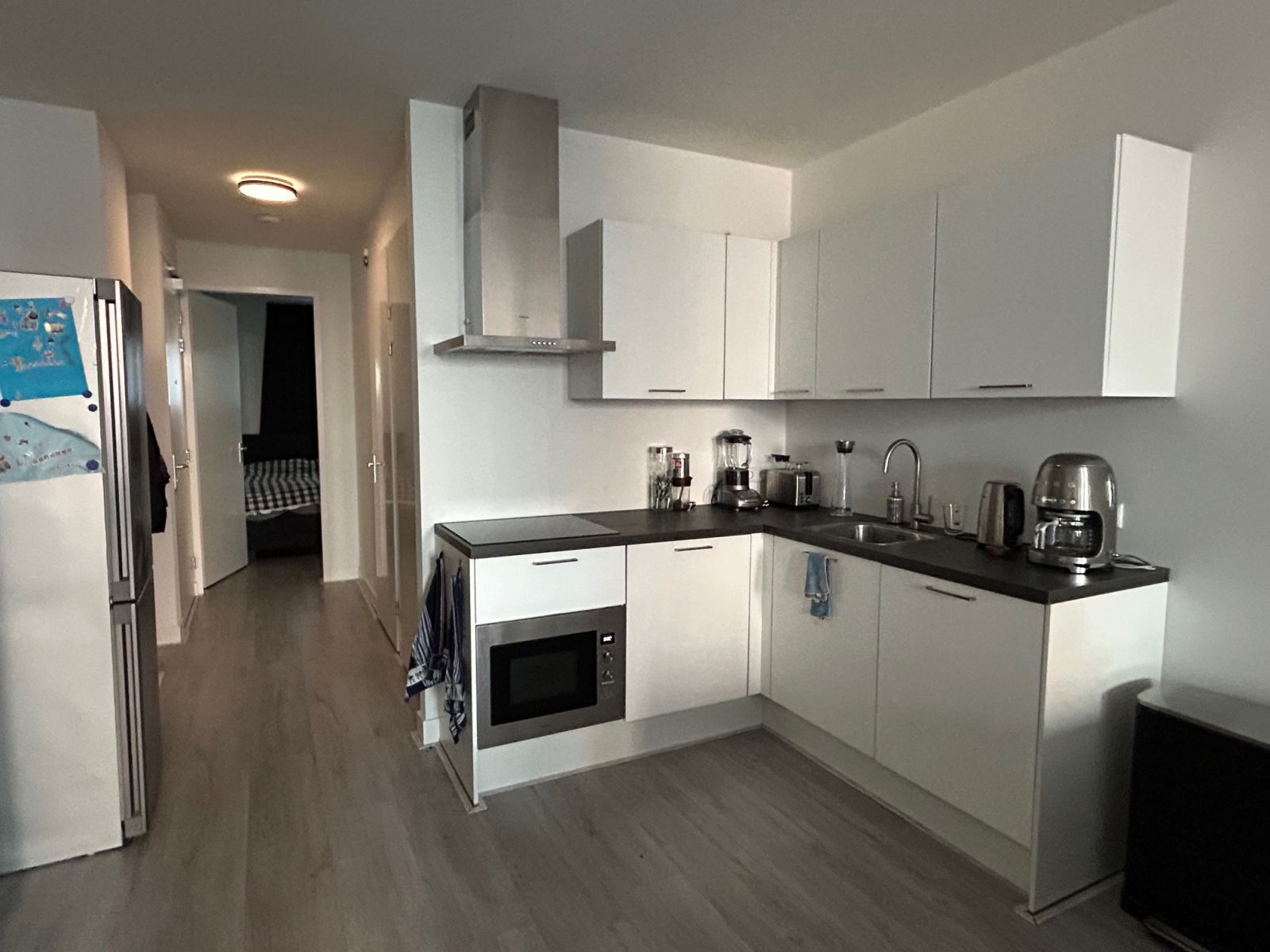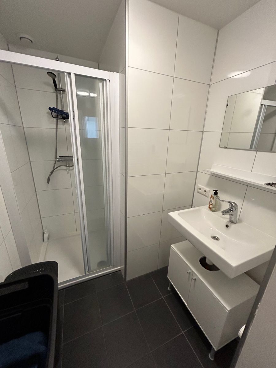 De keuken is voorzien van diverse inbouwapparatuur, waaronder een kookplaat, afzuigkap, combi-oven, vaatwasser en koelkast. De badkamer is uitgerust met een wastafel en een douche.