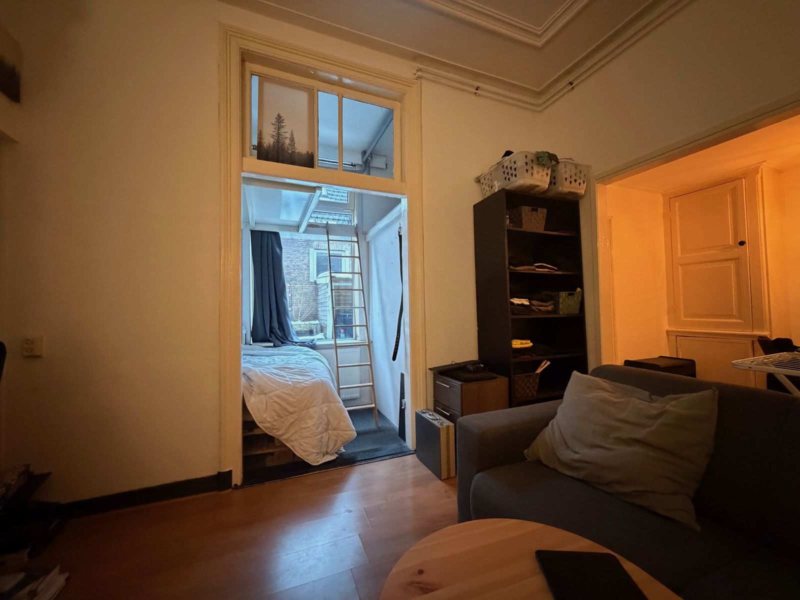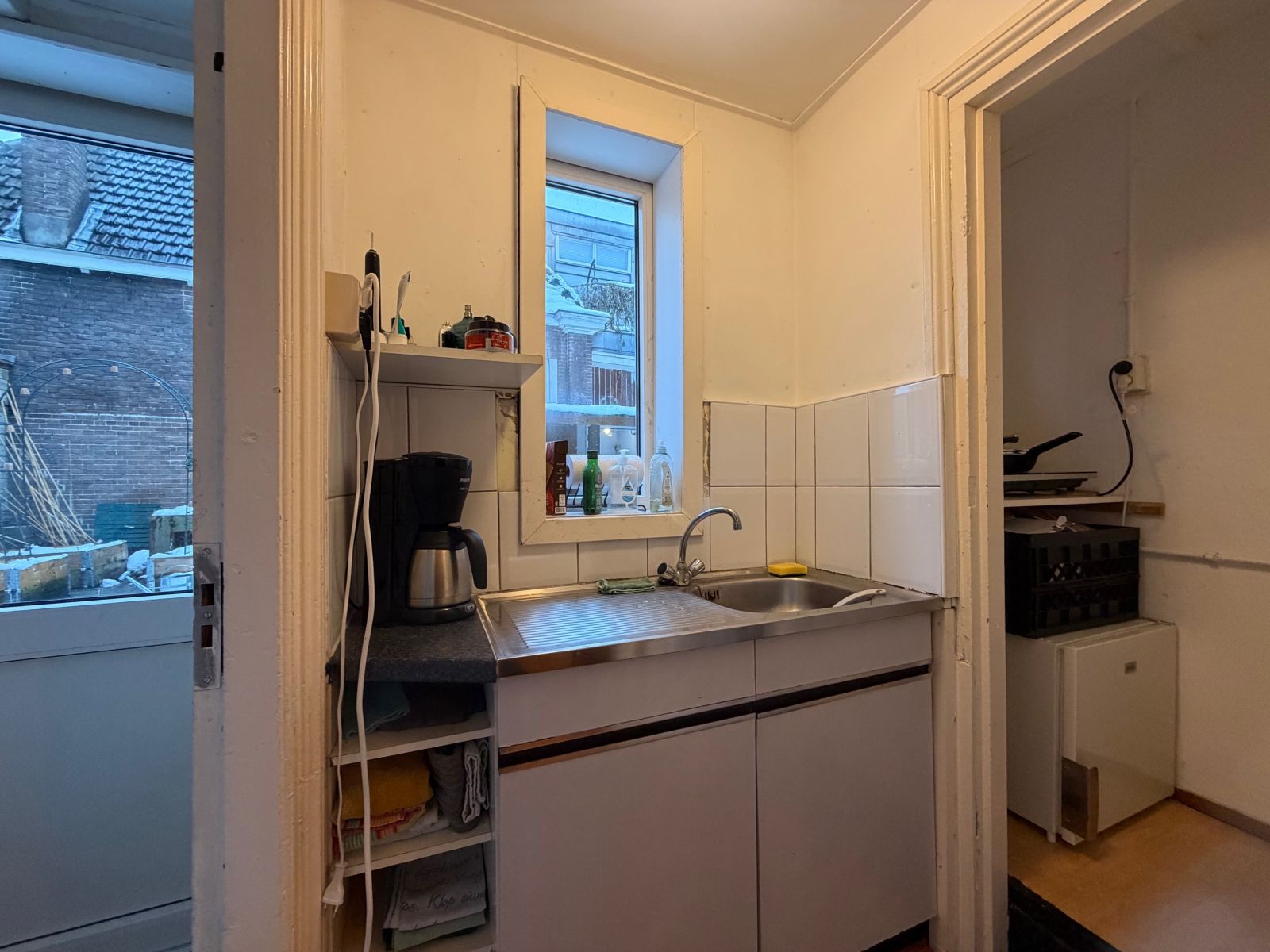 De ingang wordt gedeeld met nog één medebewoner. De kamer, gelegen op de begane grond aan de achterzijde van het pand, het is beschikbaar per 1 februari. De ruimte is ingedeeld op een speelse wijze met verschillende elementen. De kamer wordt opgeleverd zonder verdere keuken voorzieningen, zoals kookplaat, koel- vriescombinatie en afzuigkap. De douche en toilet worden gedeeld met één medebewoner. Tevens is er een gedeelde wasmachine aanwezig in de berging in de achtertuin.