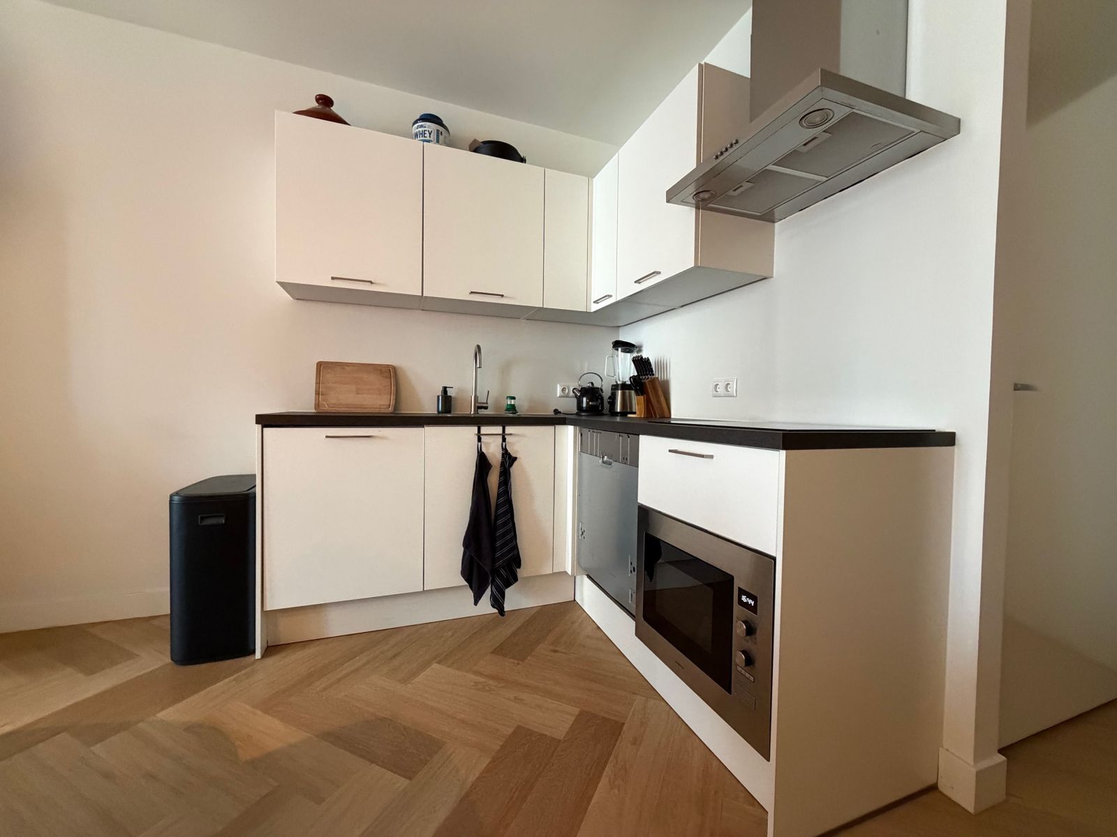 De keuken is voorzien van diverse inbouwapparatuur, waaronder een kookplaat, afzuigkap, combi-oven, vaatwasser en koelkast. De badkamer is uitgerust met een wastafel en een douche.